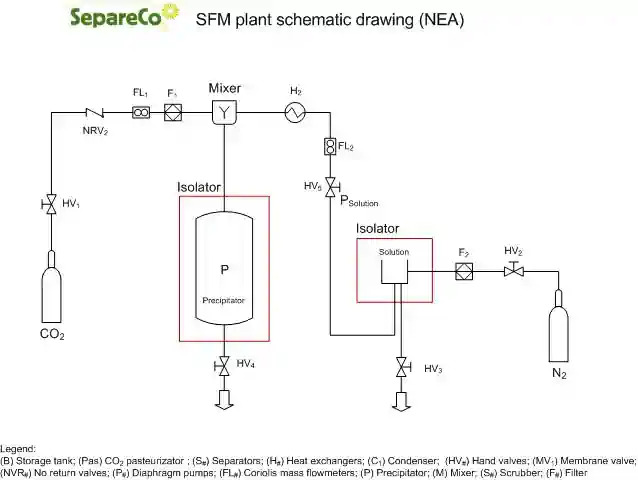 En el proceso NEA (Near-critical Expansion Atomization), el dióxido de carbono se utiliza en este proceso para la atomización y la cristalización del producto. El producto sometido al proceso se mantiene en fase líquida en un tanque de alimentación a temperatura controlada y posteriormente se transporta, a la presión deseada, a la “torre de atomización” donde entra en contacto con el dióxido de carbono liberado a presión atmosférica.