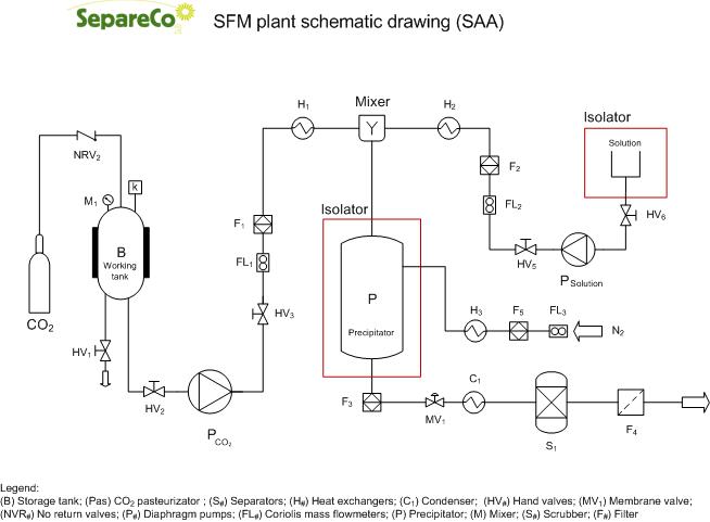 Las partículas se recogen en un filtro en el fondo del recipiente. La mezcla de solvente orgánico y SCF fluye hacia un tanque despresurizado donde las condiciones adecuadas de temperatura y presión permiten la separación gas-líquido. Después de la recolección de una cantidad suficiente de partículas, debe detenerse el rociado de solución líquida. Además, para eliminar el solvente residual, SCF puro continúa fluyendo a través del recipiente.