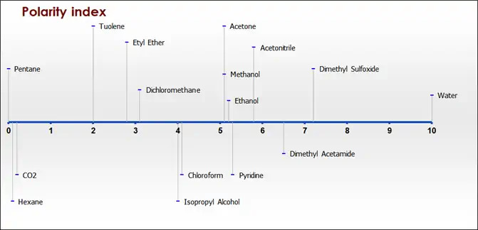 Todos los aceites son compuestos muy no polares. El CO2 es un disolvente no polar, por lo que existe una buena afinidad entre ellos. Los disolventes se clasifican según una escala de polaridad según su capacidad para disolver moléculas polares o no polares. El agua es el disolvente más polar, disuelve todo tipo de compuestos que pueden ser ionizados o que contienen restos hidrofílicos como azúcares, proteínas, aminoácidos,….