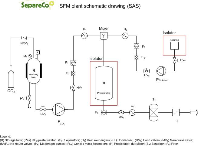 Las partículas se recogen en un filtro en el fondo del recipiente. La mezcla de solvente orgánico y SCF fluye hacia un tanque despresurizado donde las condiciones adecuadas de temperatura y presión permiten la separación gas-líquido. Después de la recolección de una cantidad suficiente de partículas, debe detenerse el rociado de solución líquida. Además, para eliminar el solvente residual, SCF puro continúa fluyendo a través del recipiente.